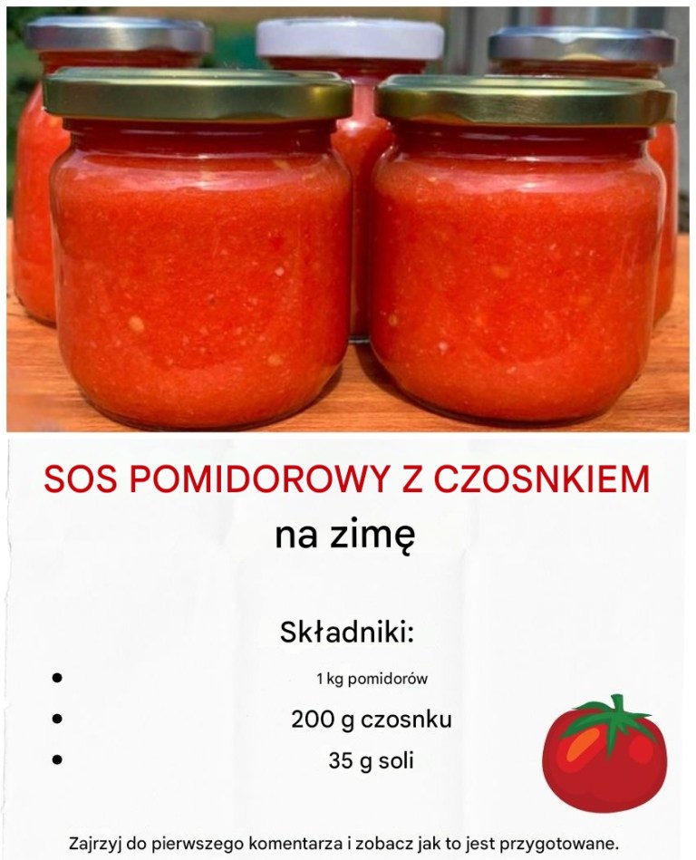 Lubię też tradycje, więc zawsze korzystam ze starych przepisów, ale z kilograma dojrzałych pomidorów przygotowuję też kilka słoików tego przepisu na „świeże” pomidory z czosnkiem i solą.